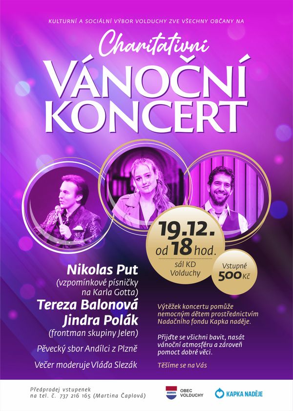 Volduchy, 19.12.2025 – V obci Volduchy se v předvánočním čase uskutečnil již 17. ročník tradičního vánočního charitativního koncertu, jehož organizátorkou je paní Martina Čaplová ve spolupráci s Obcí Volduchy. Letošní koncert přilákal širokou veřejnost a i tentokrát měl jedno hlavní poslání – pomáhat.